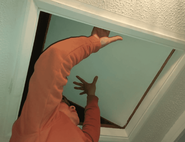 The loft was recently insulated with 200mm rockwool. The trap door itself was not insulated. Old loft insulation was removed. Space between loft trap and frame is dusty indicating draught. Loft trap doors hinged on one side with a corner cut to avoid hitting the purlin strut. Frame is cleaned thoroughly and fitted with thin foam strips. The corner hole is covered with make shift foam strips.